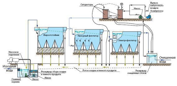 В комплекс сооружений помимо жироуловителей могут быть включены напорные флотаторы, электрофлотокоагуляторы, фильтры, а также дополнительно использоваться различные реагенты (коагулянты, флокулянты) для повышения эффективности механической, электро-химической и физико-химической очистки.